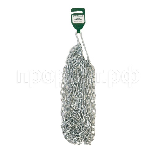 Стальная сварная будочная цепь с коротким звеном, вертлюгом и карабином. По сравнению с длиннозвенной цепью обладает большей прочностью, но меньшей подвижностью звеньев. Производится из углеродистой стали и обрабатывается цинком гальваническим методом. Диаметр сечения звена 3мм.